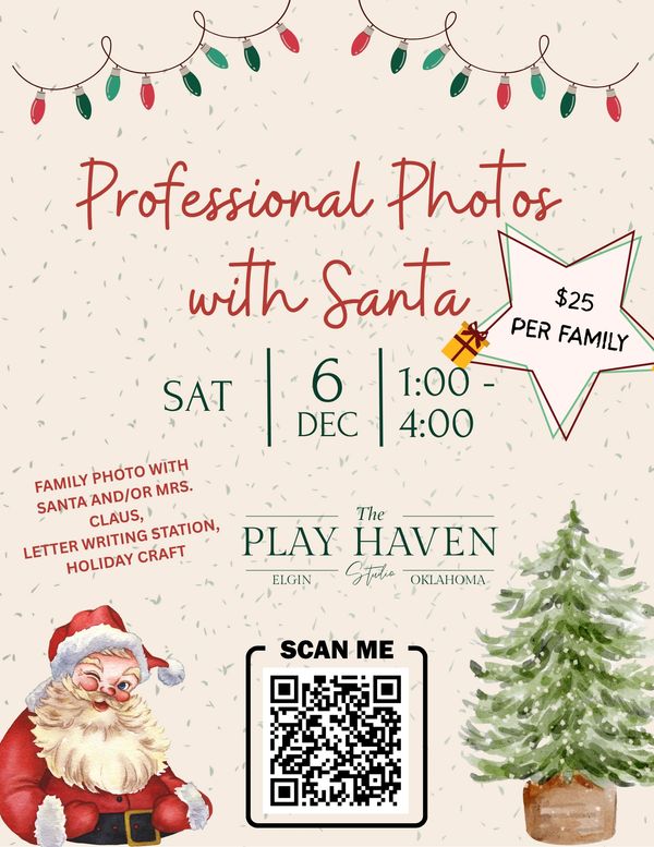Scan the QR code on the flyer to save your spot and get ready for a holly jolly good time at The Play Haven Studio, Elgin, Oklahoma!